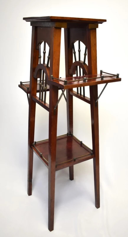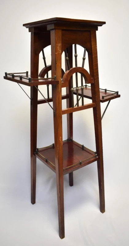 Elegant piedestal-etajeră de început de secol XX, realizat în jurul anului 1910, o perioadă de tranziție între Art Nouveau și primele forme ale stilului Art Deco. Piesa poartă timbrul/vinieta atelierului Mauriciu Filip Lazar – Bucuresci, un nume renumit în mobilierul urban românesc de început de secol.