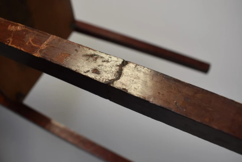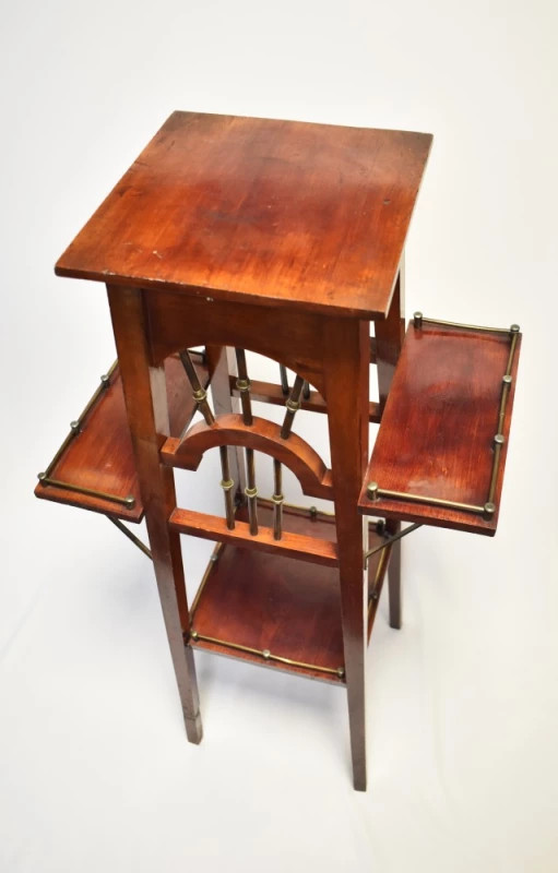 Structura este realizată din lemn masiv, cu picioare înalte și siluetă aerisită, iar pe cele două niveluri sunt inserate elemente din alamă, folosite atât decorativ, cât și funcțional. Balustradele arcuite și tăieturile geometrice sunt reprezentative pentru estetica de început de secol XX.
