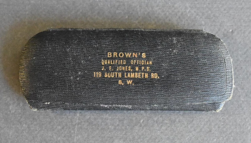 Rar și extrem de elegant pince-nez de epocă, datat în secolul XIX, realizat cu rame metalice fine, lentile circulare și lanț de siguranță, păstrat în etuiul original, marcat Browns – South Lambeth.