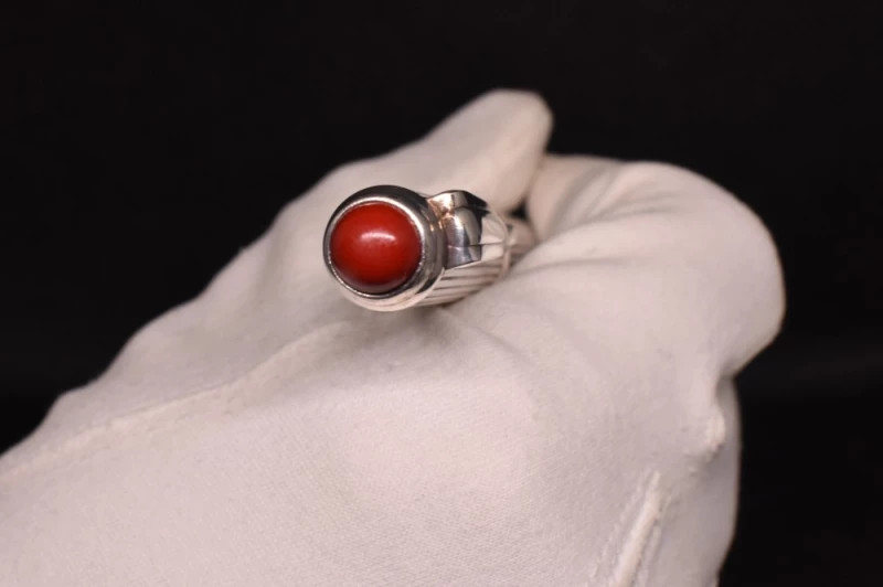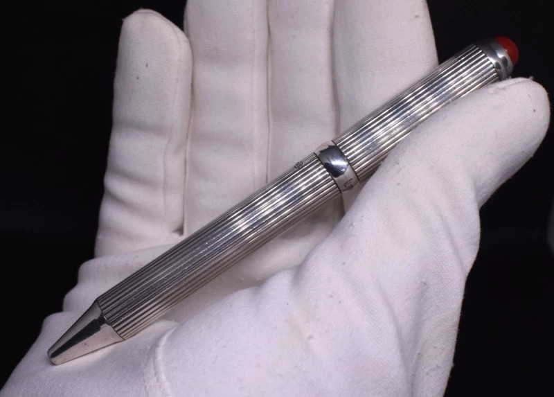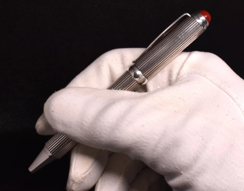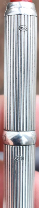 Corpul pixului este realizat integral din argint masiv fin striat, oferind o textură plăcută la atingere și un joc subtil de lumină. Designul este completat de un element decorativ din coral roșu natural, montat cu finețe, care adaugă un accent cald și prețios, evocând bijuteriile italiene clasice.