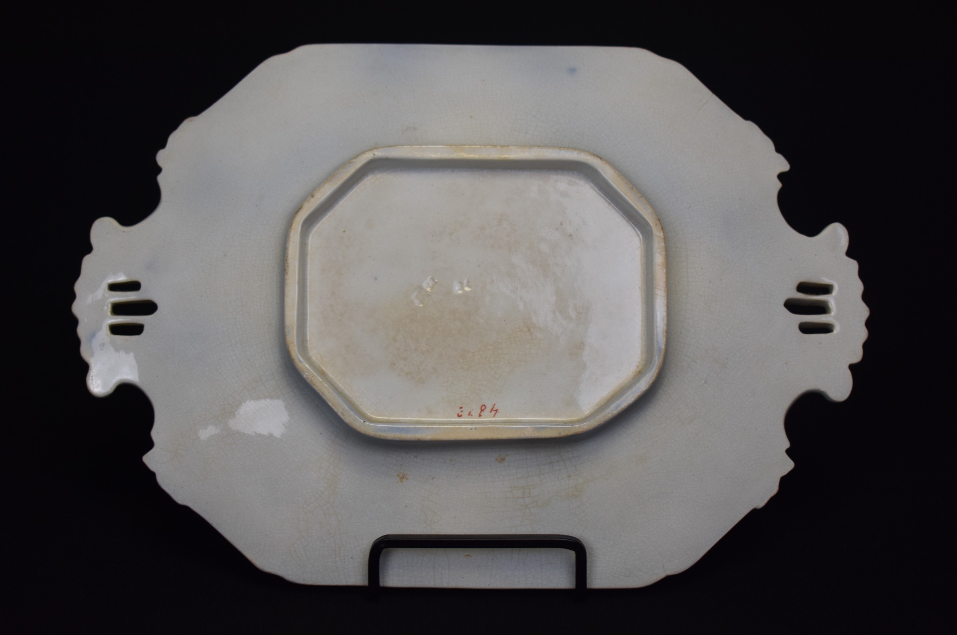 Acest platou decorativ din ceramică, realizat în Anglia în perioada interbelică, este o piesă reprezentativă pentru fascinația Europei occidentale față de Orient și estetica chinoiserie, extrem de populară în prima jumătate a secolului XX.