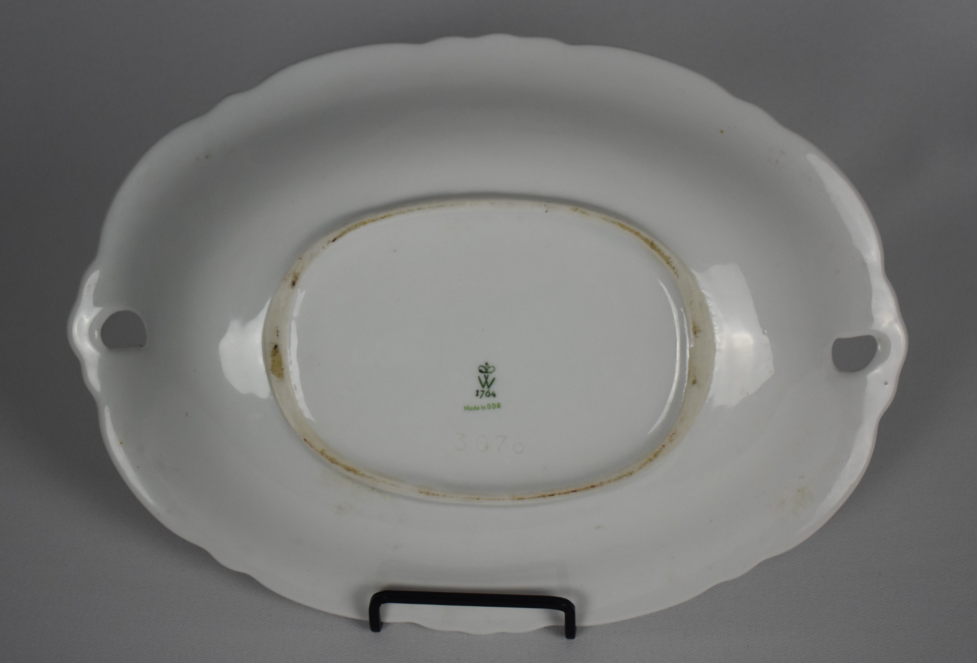 Acest platou elegant din porțelan Wallendorf, realizat în Germania, este o piesă clasică de porțelan european decorativ, remarcabilă prin rafinamentul execuției și bogăția ornamentației.