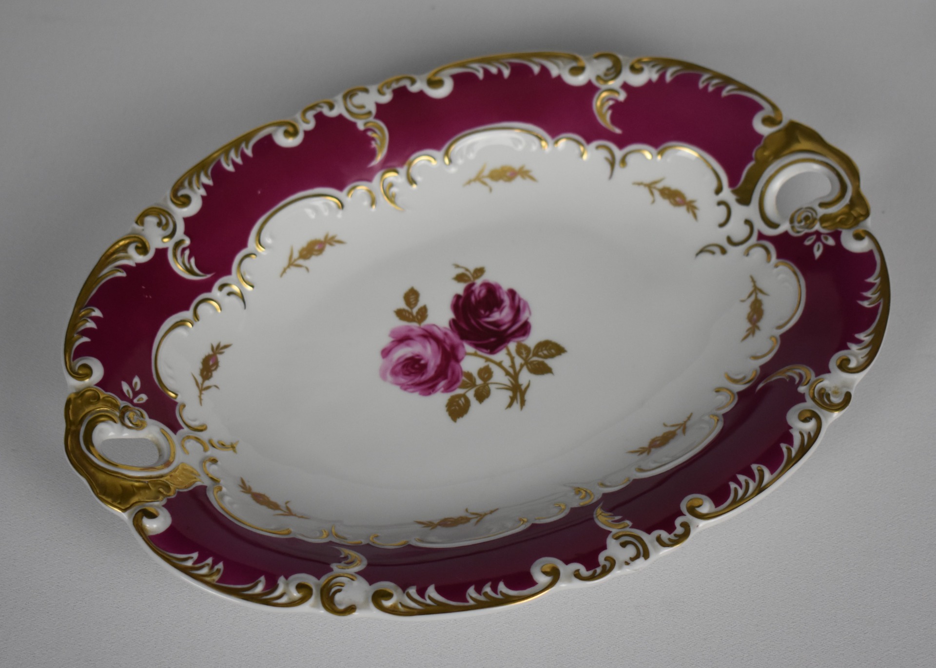 Platoul are o formă ovală amplă, prevăzută cu două anse sculptate, aurite, integrate armonios în conturul unduitor al piesei. Marginea este decorată cu o bandă bordo intens, accentuată de motiv rocailles stilizat și aurire bogată, aplicată manual, specifică manufacturii Wallendorf.