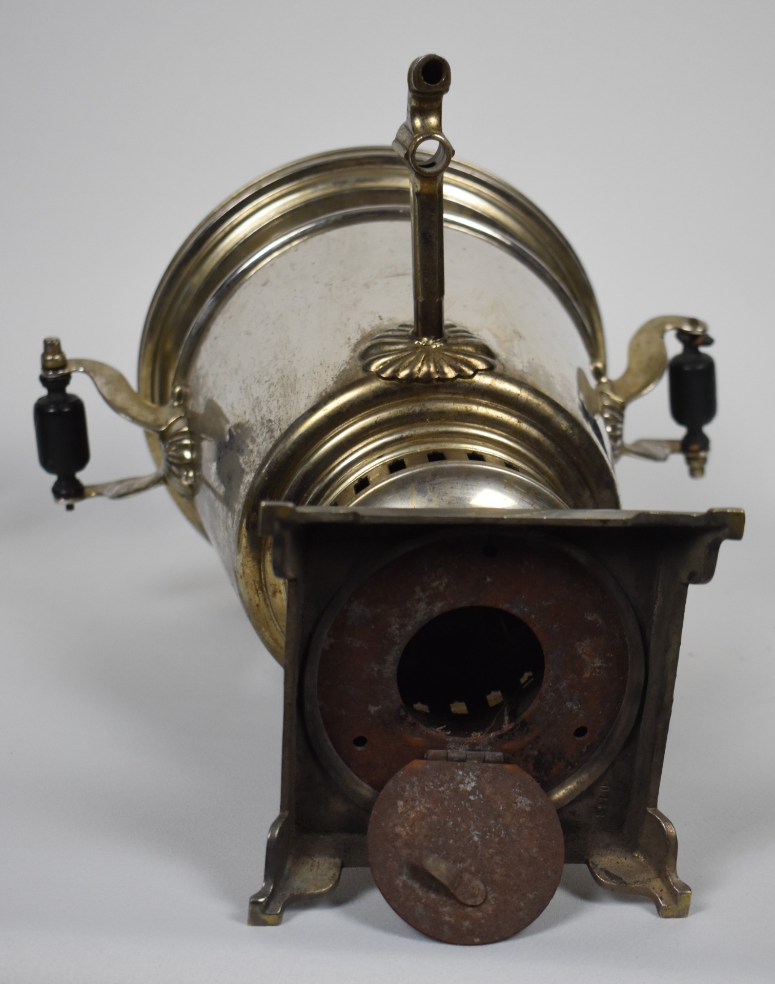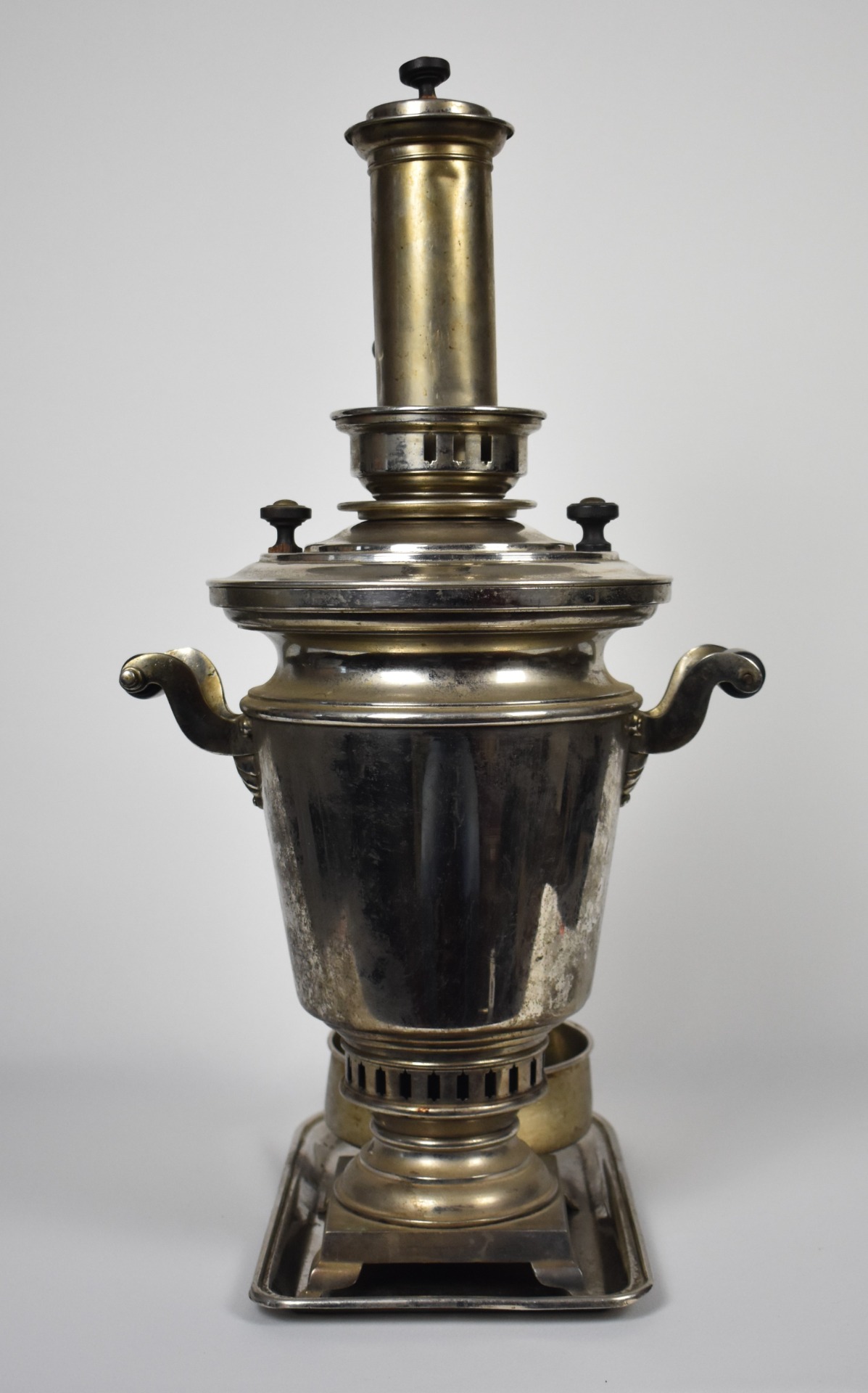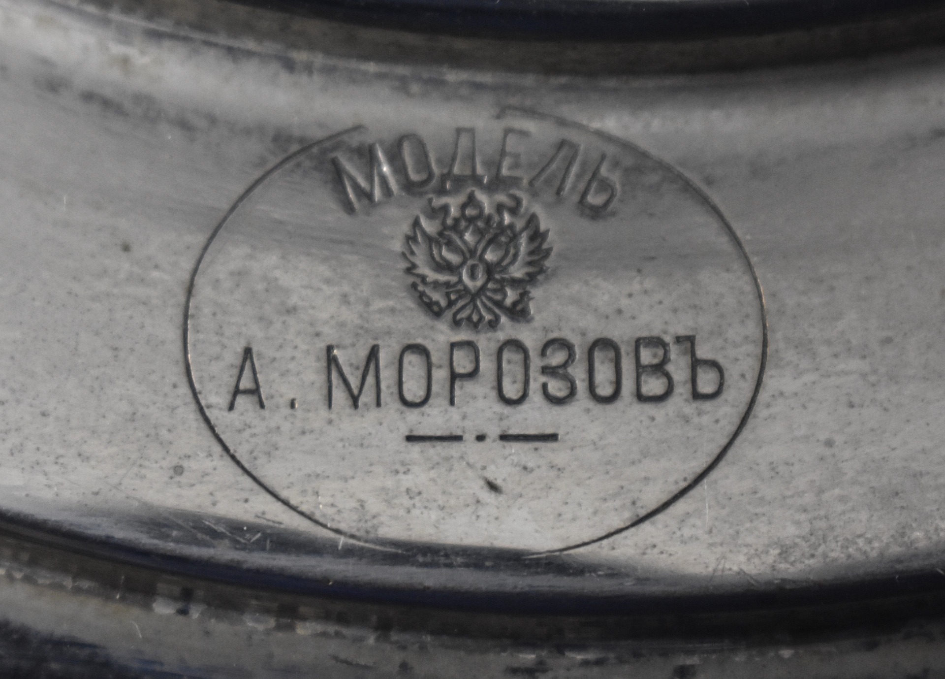 Samovar autentic de proveniență rusească, realizat în celebra manufactură A. Morozov din Tula, oraș faimos pentru producția de samovare încă din secolul XVIII. Model nichelat, lucrat în jurul anului 1900, cu formă clasică, corp bombat și elemente metalice solide, păstrând specificul samovarelor de epocă.