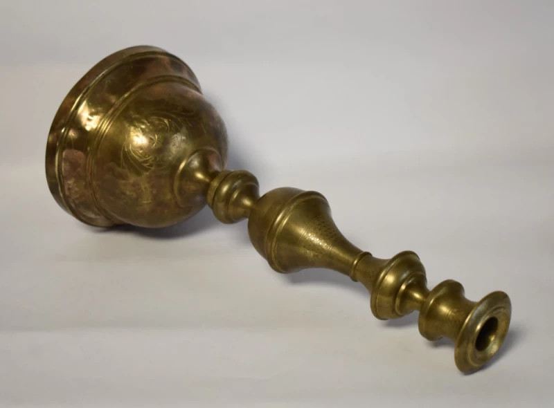Acest sfeșnic elegant din alamă ambutisată, databil la sfârșitul secolului al XIX-lea, poartă amprenta sobrietății decorative specifice interiorului european de epocă. Silueta sa zveltă și armonioasă, construită pe un ax în trepte echilibrate, conduce privirea către baza amplă, decorată discret prin motivic floral-gravurat, obținut prin tehnica ambutisării.