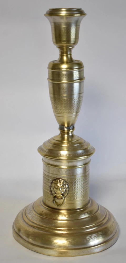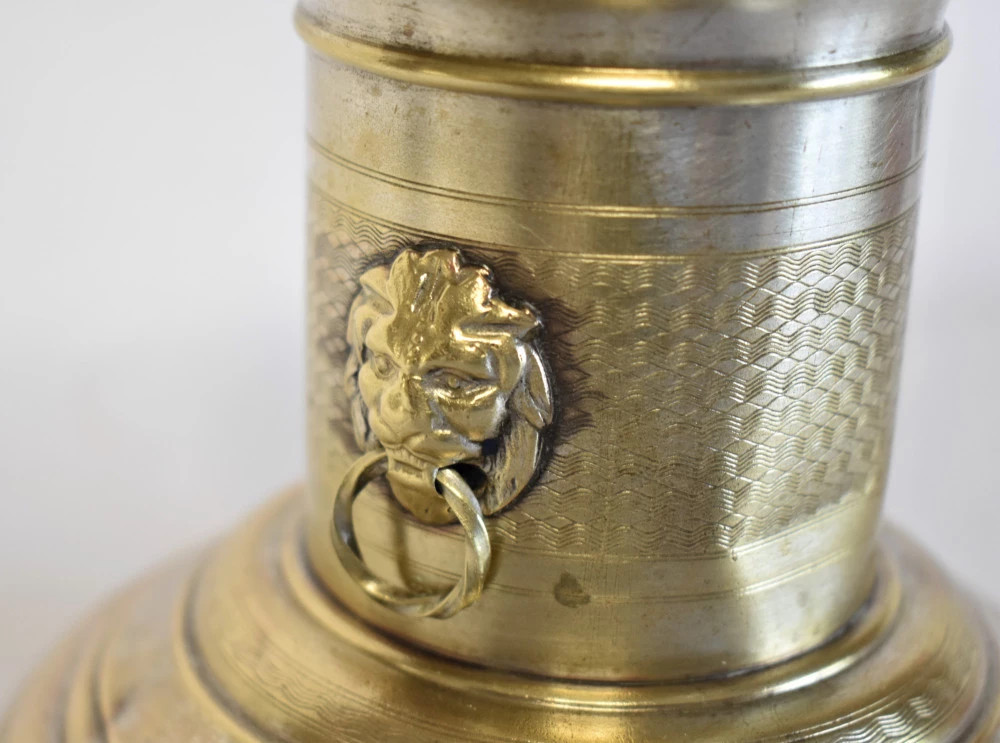 Impunător sfeșnic de epocă, realizat la sfârșitul secolului XIX, din alamă argintată, cu un elegant decor zoomorf reprezentând lei, simboluri clasice ale forței, autorității și nobleței. Piesa impresionează prin proporțiile echilibrate, baza amplă și corpul profilat, ornamentat discret cu registre gravate.