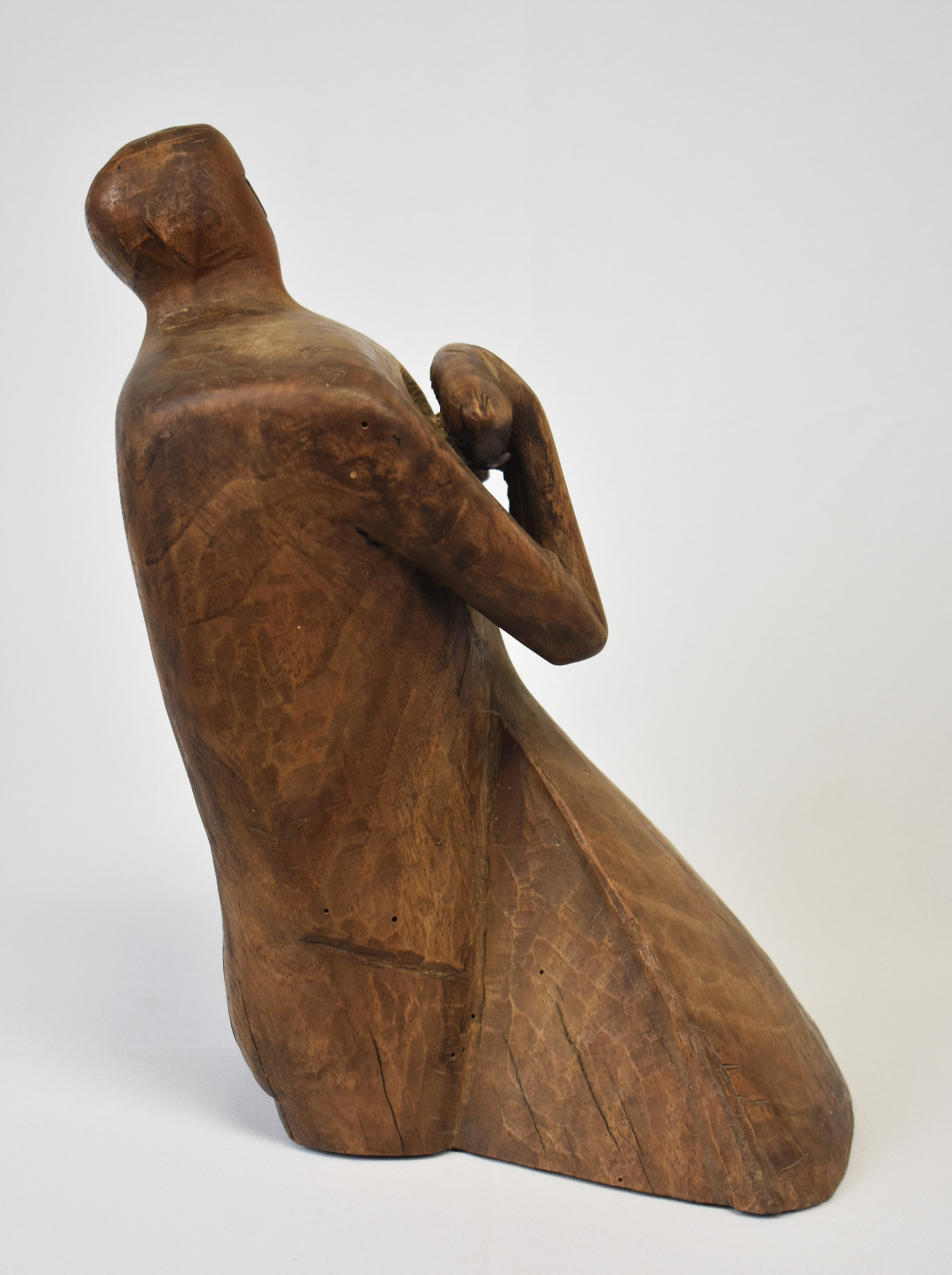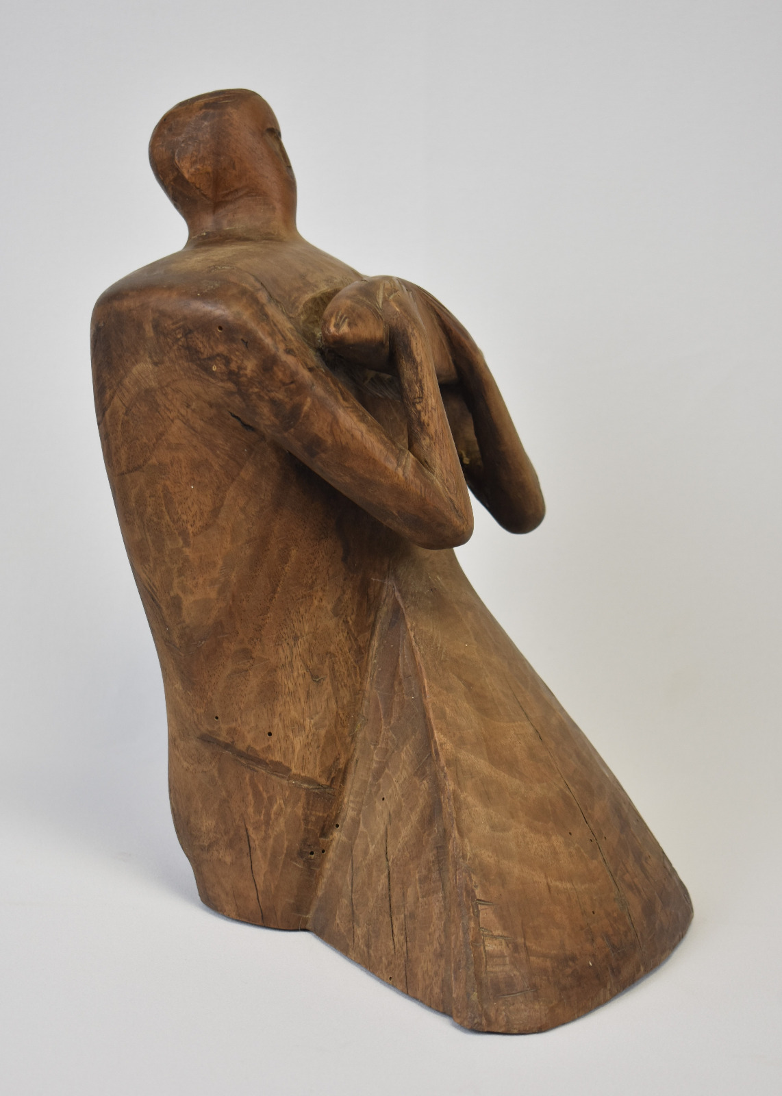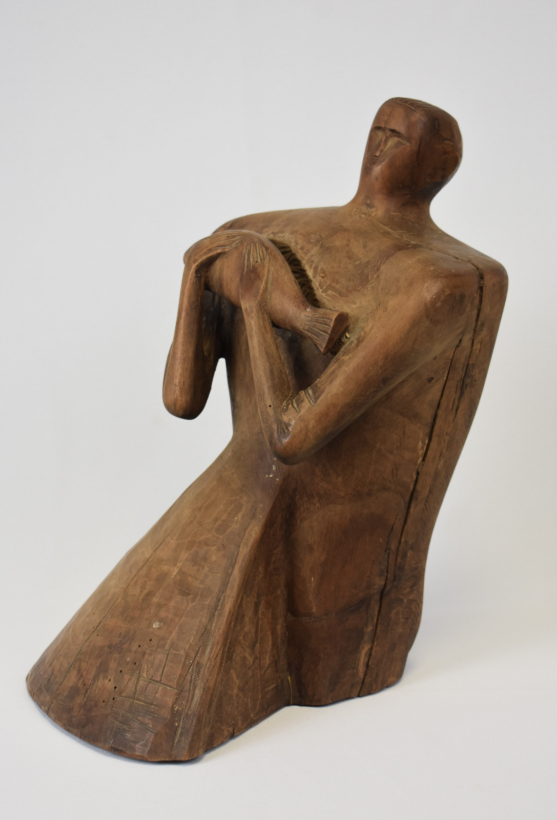 Liniile corpului sunt sculptate cu o forță brută, păstrând urmele daltei și textura naturală a lemnului, ceea ce conferă lucrării autenticitate și vitalitate. Poziția ușor înclinată a figurii și gestul protector al brațelor creează o dinamică subtilă, transformând obiectul într-o prezență sculpturală puternică în spațiul în care este expus.