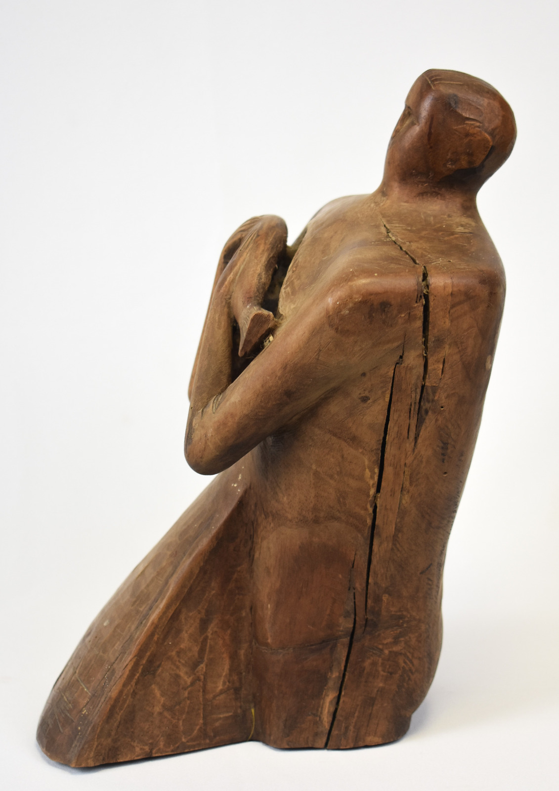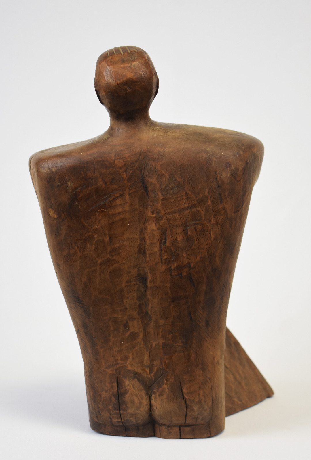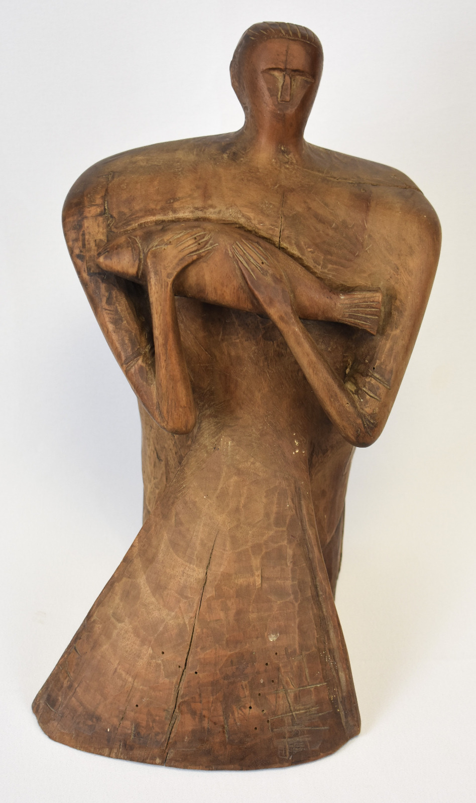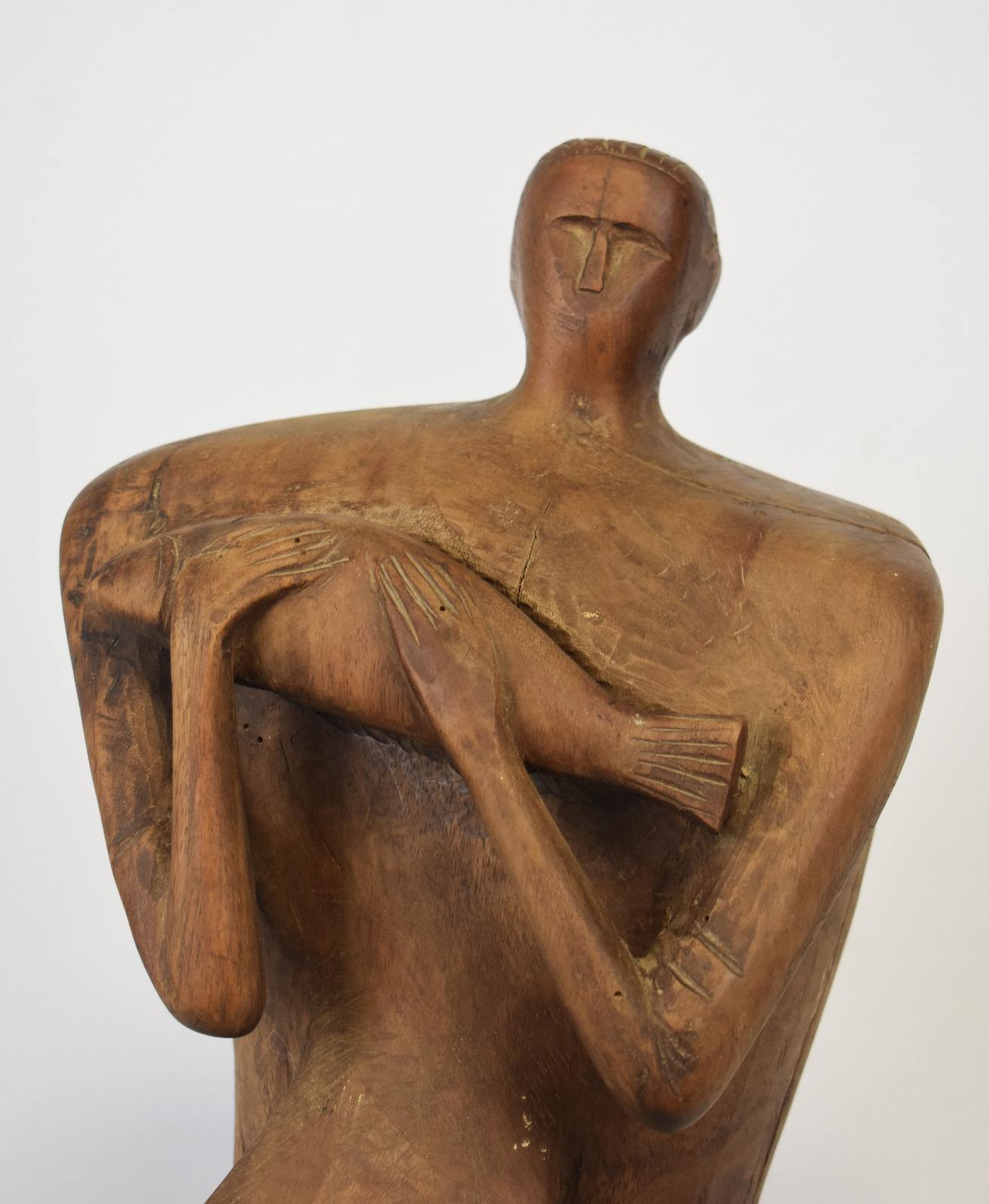 Liniile corpului sunt sculptate cu o forță brută, păstrând urmele daltei și textura naturală a lemnului, ceea ce conferă lucrării autenticitate și vitalitate. Poziția ușor înclinată a figurii și gestul protector al brațelor creează o dinamică subtilă, transformând obiectul într-o prezență sculpturală puternică în spațiul în care este expus.