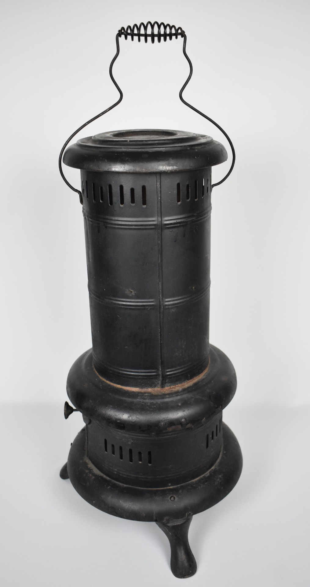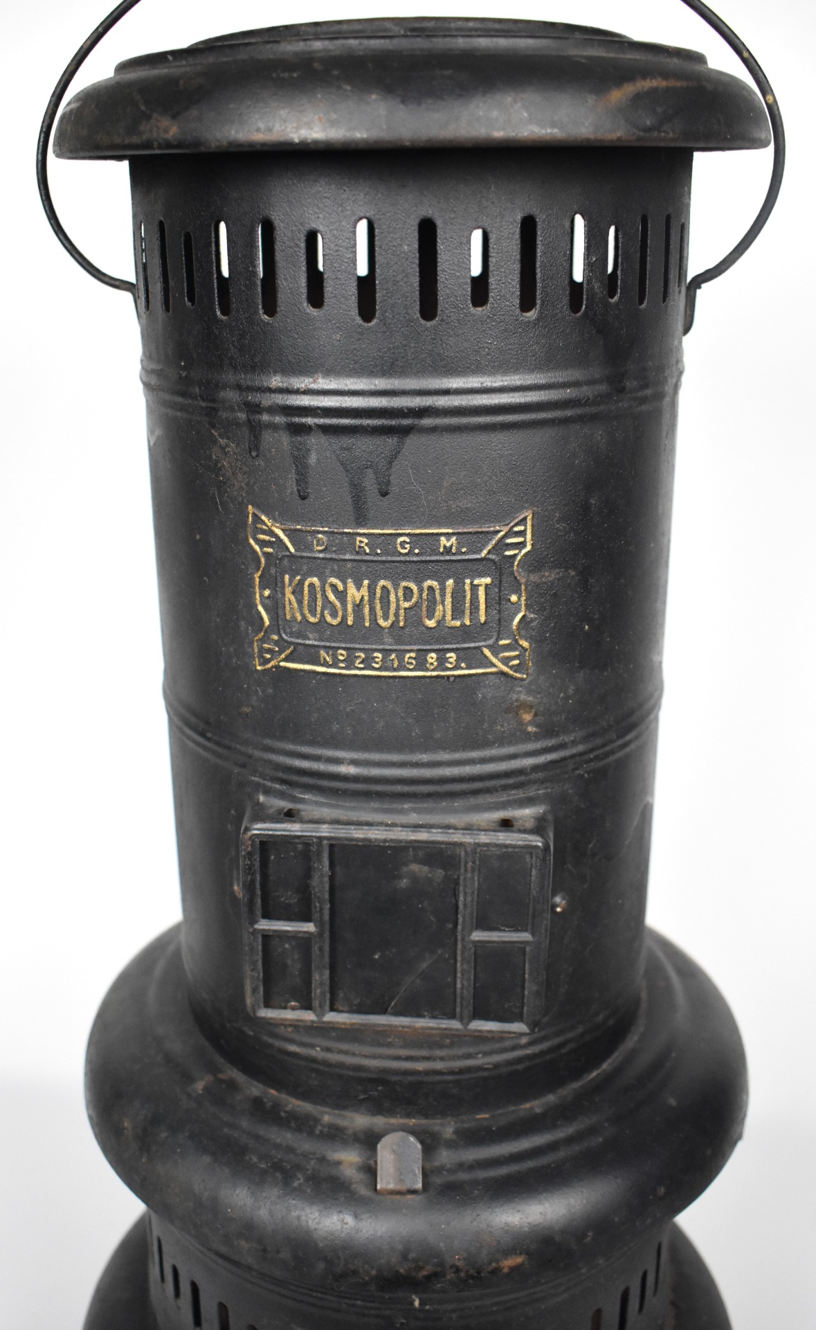 Sobă veche pe petrol, model "Kosmopolit", realizată în stil Godin, specific începutului de secol XX. Construită integral din metal, cu formă cilindrică și picioare stabile, această sobă reflectă estetica industrială elegantă și funcționalitatea robustă a pieselor de încălzire de epocă.