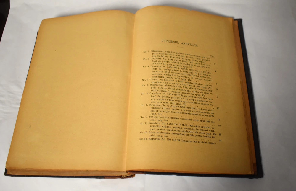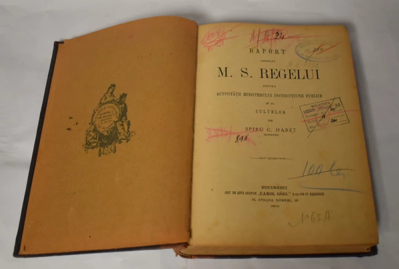 Exemplar original al lucrării "Raport adresat M. S. Regelui Carol I asupra activității", redactată de Spiru C. Haret și publicată în anul 1903, document esențial pentru istoria educației și administrației moderne din România.