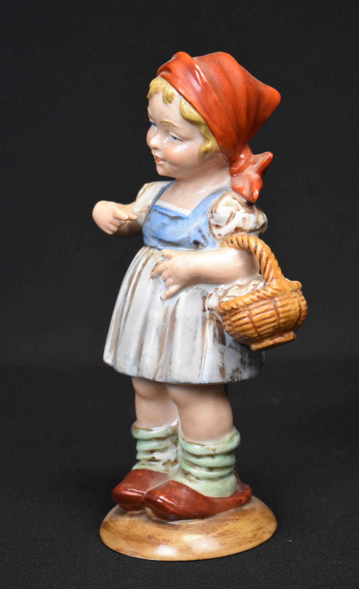 Copila este surprinsă într-un moment candid, cu gesturi naturale și expresie senină, purtând basmaua roșie emblematică și coșulețul din împletitură fin modelată. Cromatica este caldă și echilibrată, iar glazura lucioasă pune în valoare detaliile vestimentare și expresivitatea chipului.