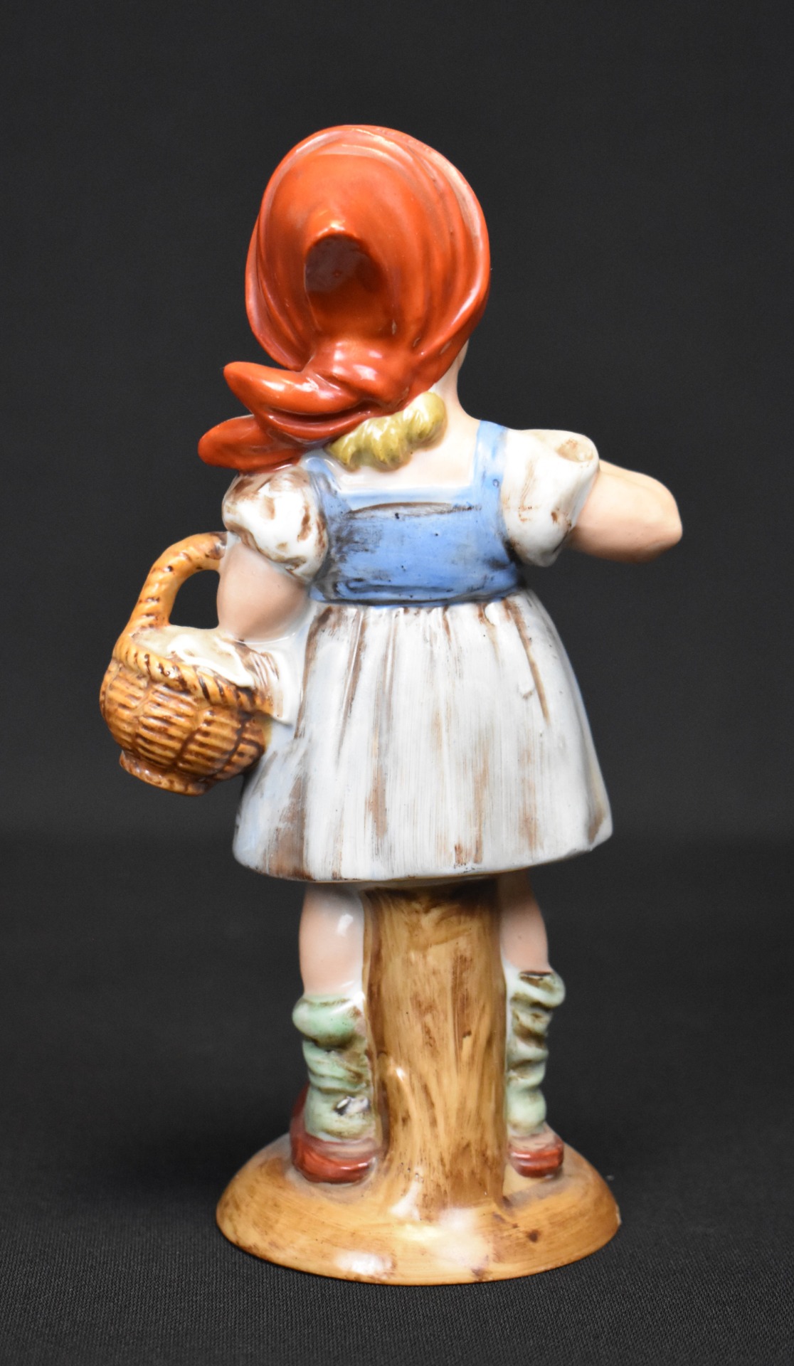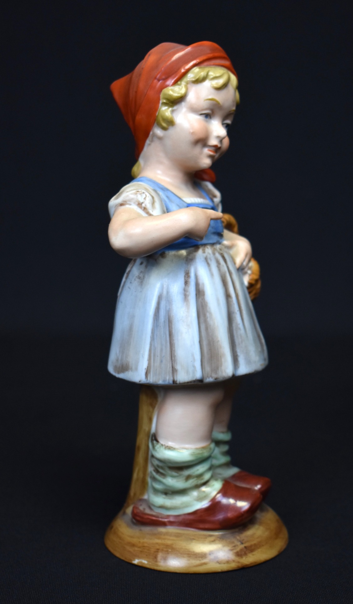 Delicată și plină de farmec, această statueta din porțelan redă cu grație inocența personajului Scufița Roșie, într-o interpretare specific germană, de o mare finețe artistică. Realizată la prestigiosul atelier Wagner & Apel (W&A), după un model semnat Hilla Peyk & Bertram, piesa datează din jurul anilor 1940.