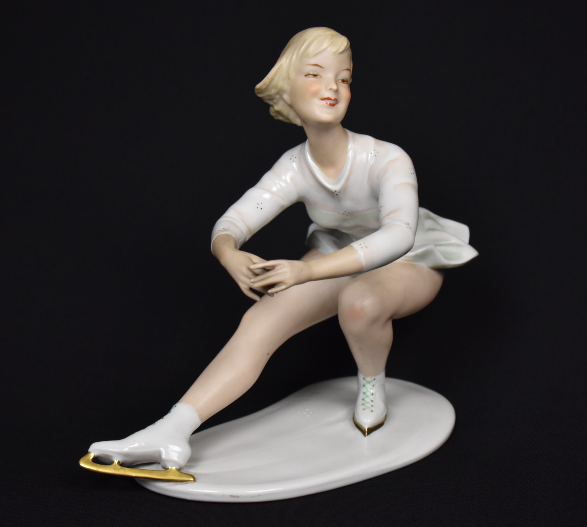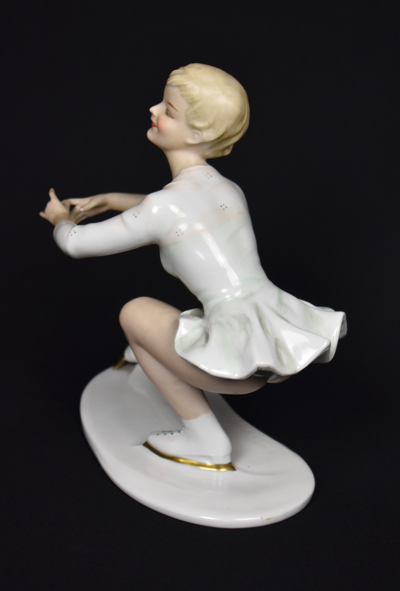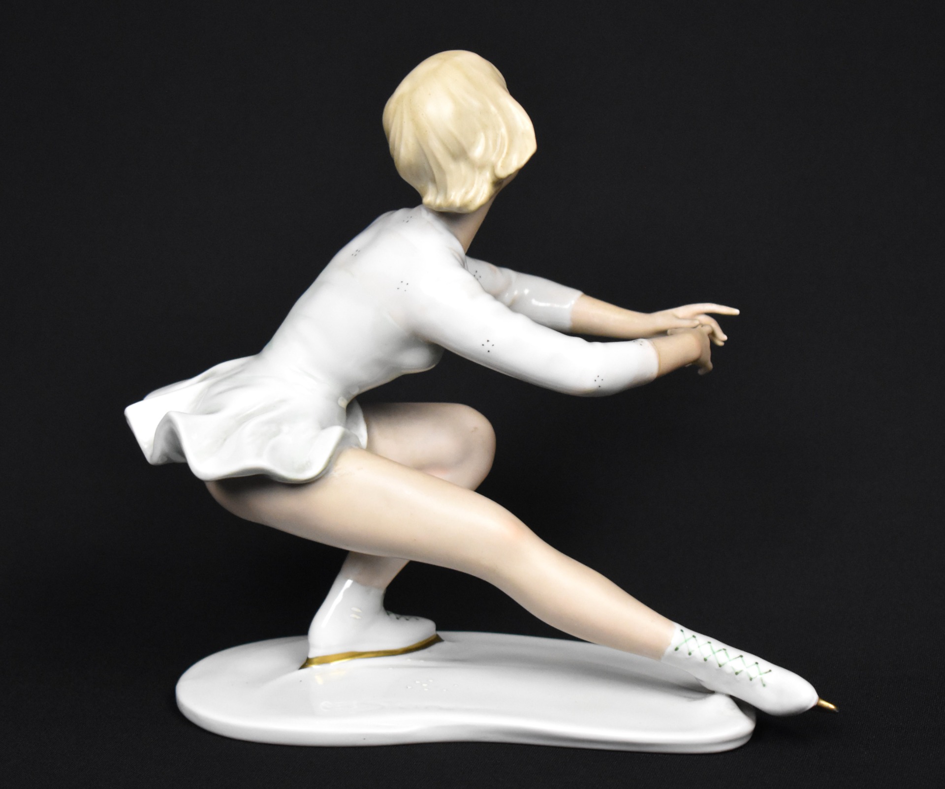 Statuetă elegantă din porțelan fin Wallendorf, reprezentând o patinatoare în plină mișcare, surprinsă cu grație și echilibru pe gheață. Modelată și decorată cu mare atenție anatomico-plastică, piesa este semnată de artistul Kurt Steiner, cunoscut pentru figurinele dinamice și expresive realizate pentru celebra manufactură germană.