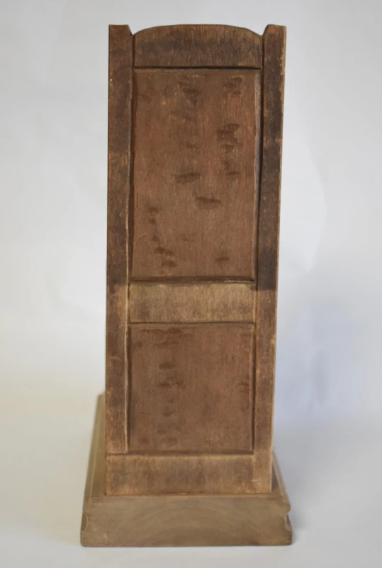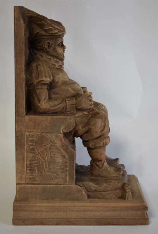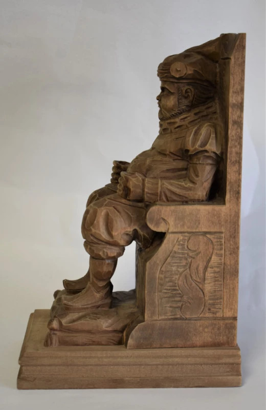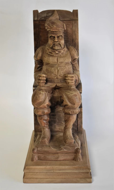 Impresionantă statuetă veche sculptată integral din lemn, reprezentând un rege / domnitor așezat pe tron, realizată cu minuțiozitate și simț al volumului. Personajul este redat într-o postură solemnă, având trăsături faciale ferme, barbă și mustață bine conturate, îmbrăcăminte de inspirație istorică și o atitudine ce sugerează autoritate, demnitate și putere.