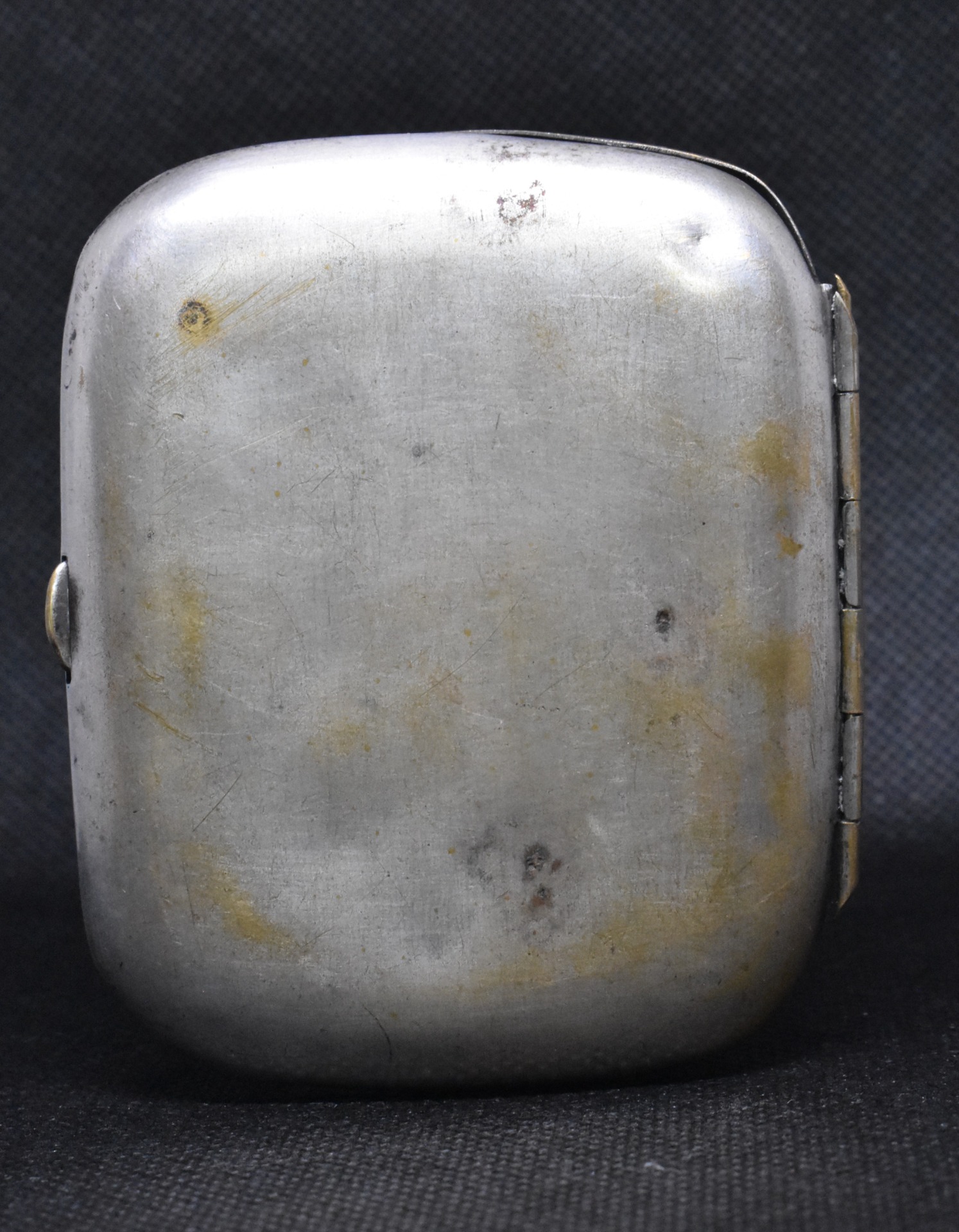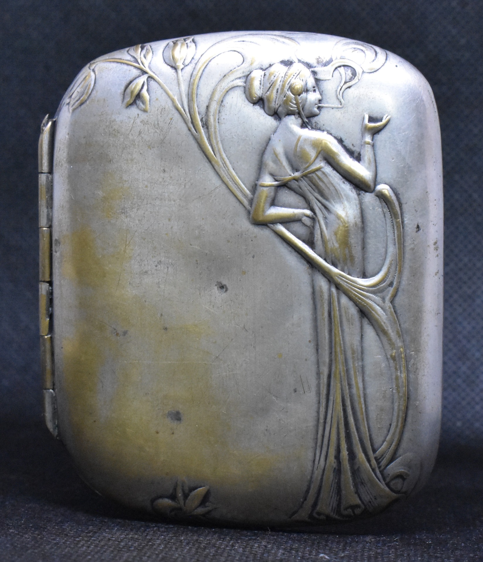Tabacheră elegantă de început de secol XX, destinată doamnelor, realizată în stil Art Nouveau, cu un relief rafinat reprezentând o figură feminină în atitudine grațioasă, surprinsă într-un moment intim de fumat. Silueta alungită, liniile ondulate ale veșmântului și motivele vegetale stilizate sunt caracteristice limbajului decorativ organic al epocii Belle Époque.