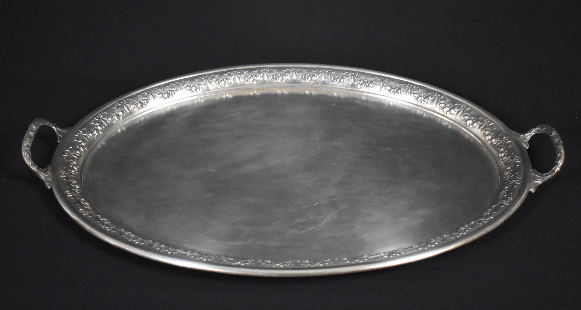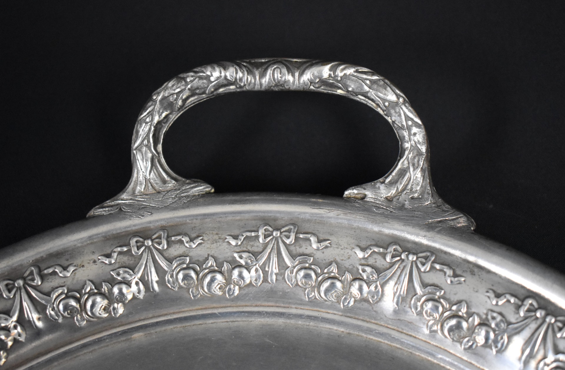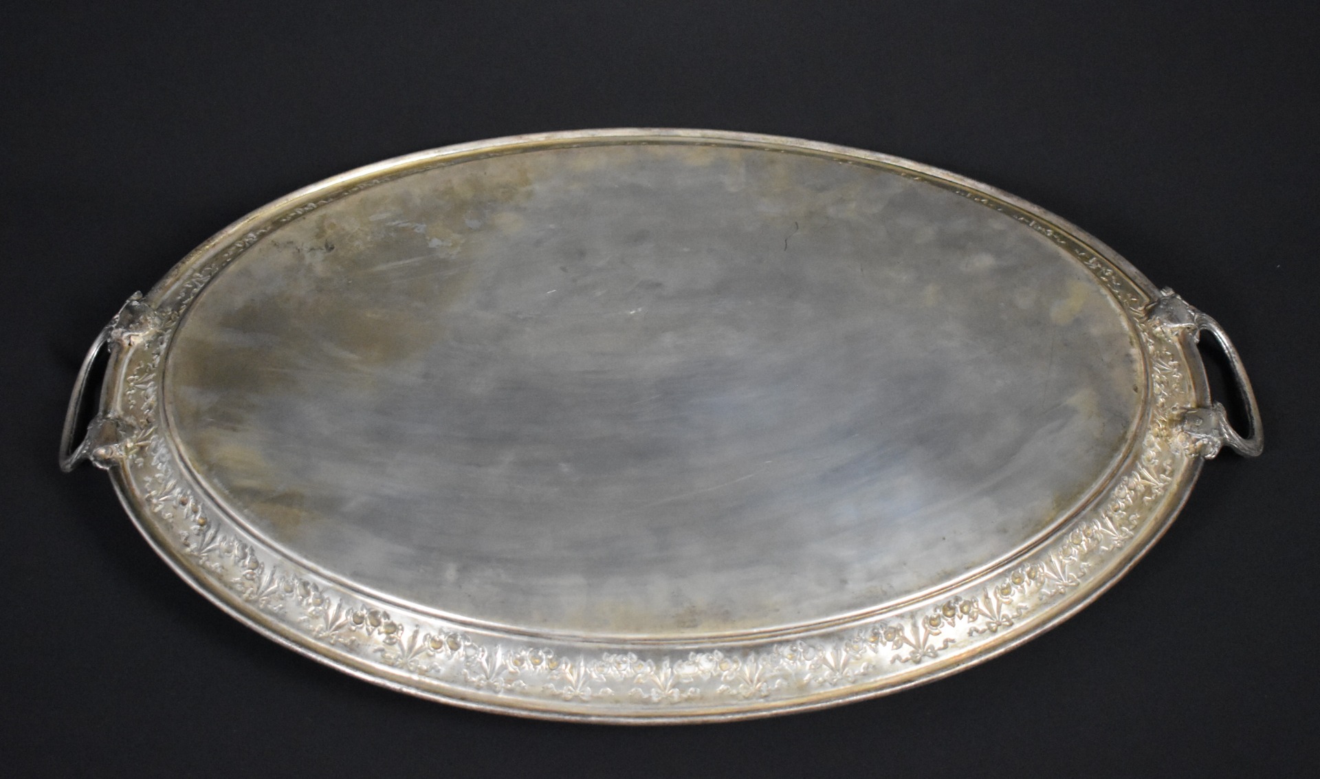 Elegantă și impunătoare, această tavă veche din alamă argintată datează din jurul anului 1900 și impresionează prin proporțiile generoase și prin bordura bogat ornamentată cu motive florale în relief. Mânerele laterale, turnate și decorate în aceeași manieră, completează aspectul rafinat al piesei, tipic servirii de epocă din saloanele europene de la începutul secolului XX.