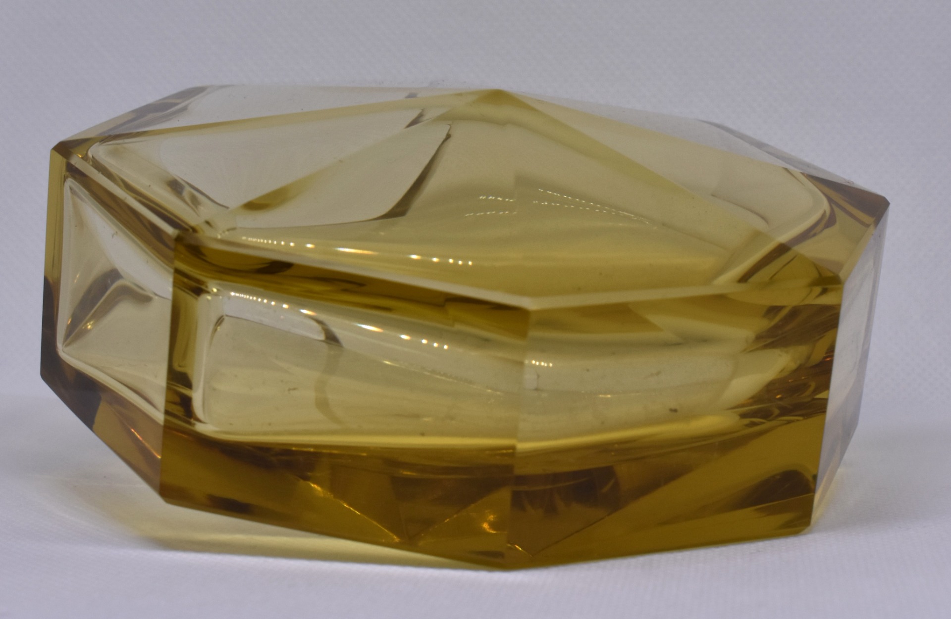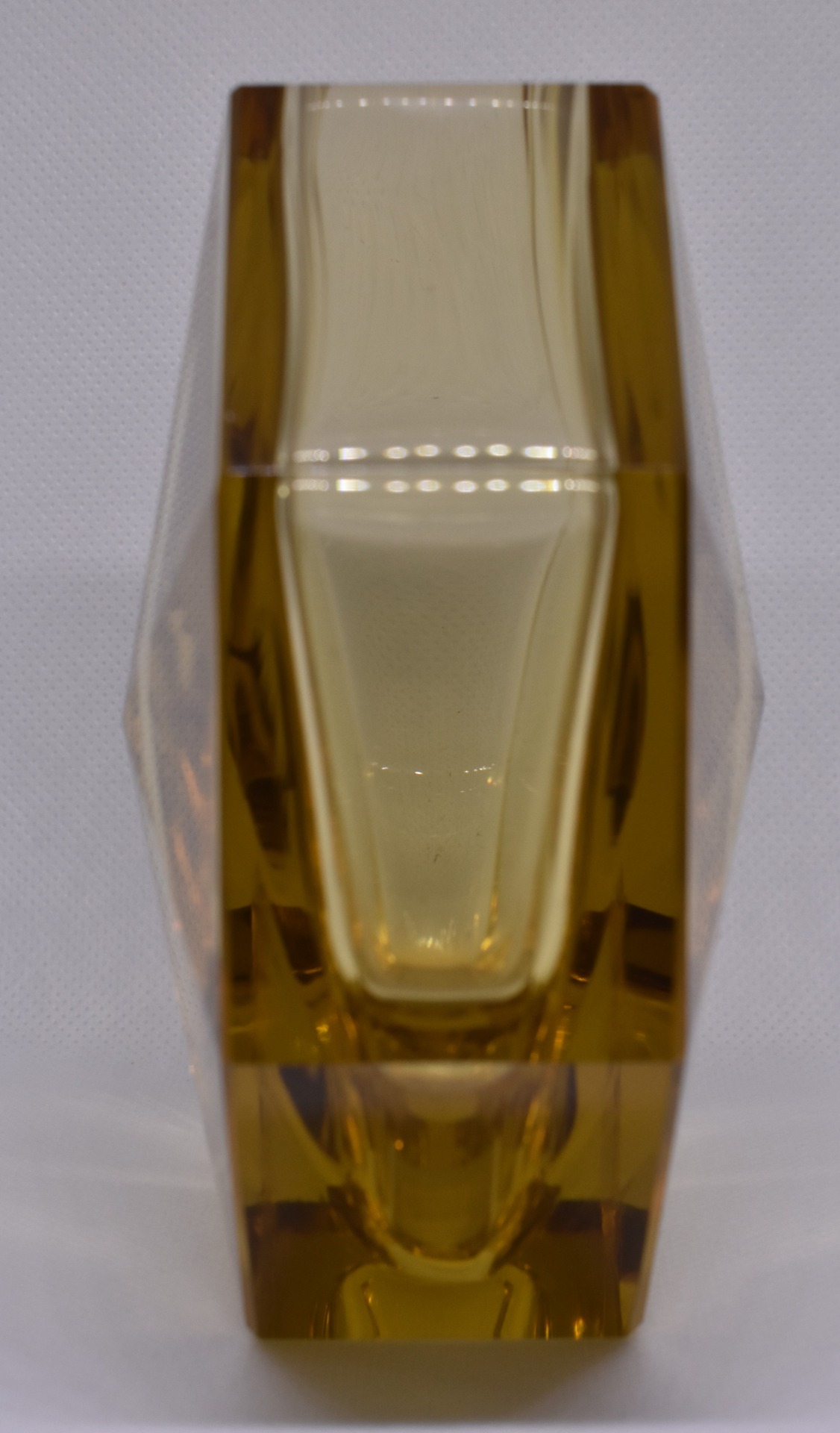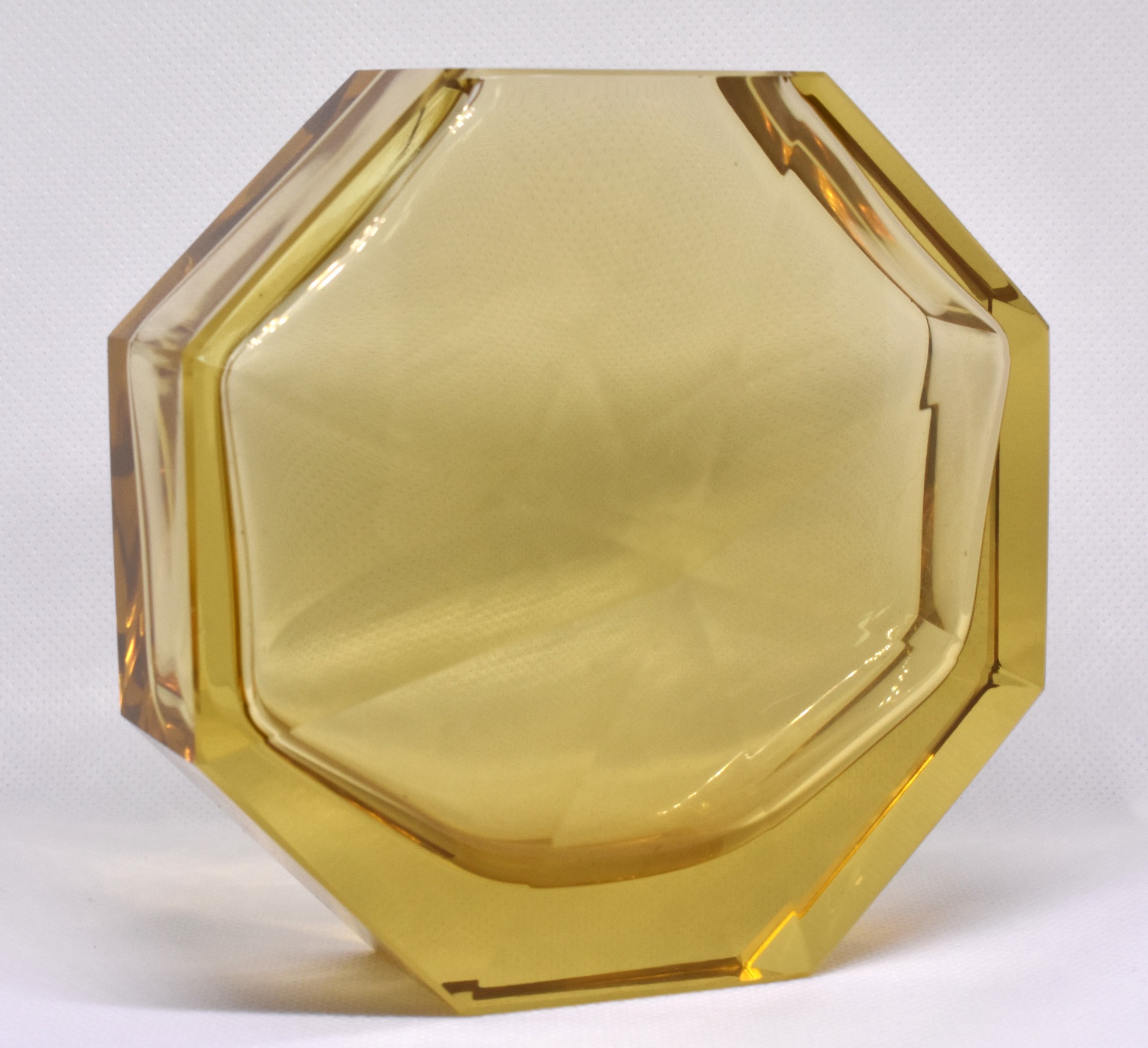 Descoperă această vază Art Deco autentică, creată într-un atelier italian în anii 1950, când esteticile interbelice se împleteau cu tendințele moderniste. Realizată din cristal masiv, piesa impresionează prin forma sa geometric-poligonală, cu fațete ample și muchii precise — detalii care conferă volum, luminozitate și un puternic impact vizual.
