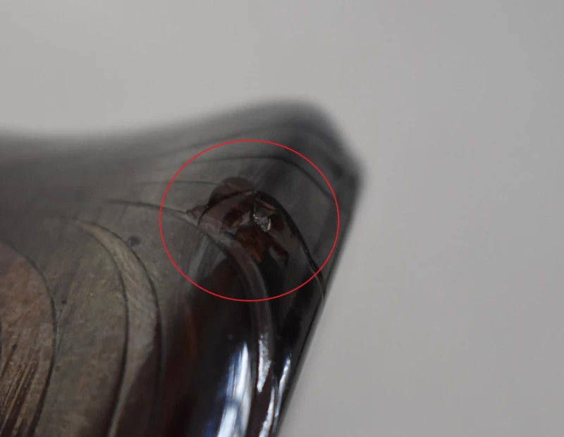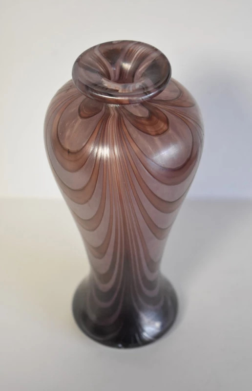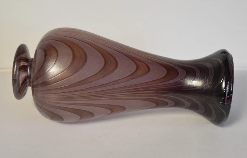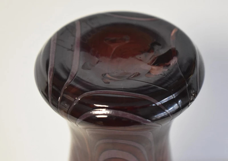 Sticla prezintă nuanțe profunde de mov cu variații tonale, dispuse într-un model curgător, aproape organic, ce accentuează verticalitatea siluetei. Efectul vizual este unul rafinat și profund, sugerând tehnici avansate de lucru cu sticla artistică întâlnite în atelierele franceze ale primei jumătăți de secol XX.