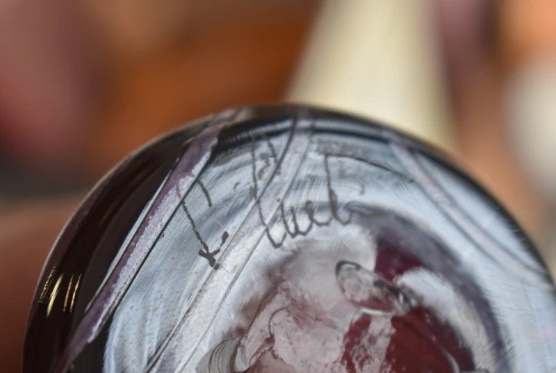 Vaza poartă o semnătură incizată, parțial indescifrabilă, element care confirmă proveniența sa dintr-un atelier artistic și caracterul de piesă unicat sau de serie limitată. Deși autorul exact nu poate fi identificat cu certitudine, stilul, cromatica și execuția o plasează ferm în contextul artei decorative franceze interbelice.